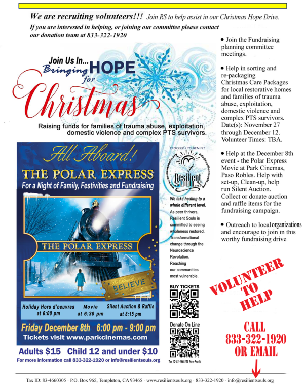 Resilient Souls will be holding a fundraiser on December 8, 2023 at 6 in the evening. The event will take place at Park Cinemas, with a family friendly evening of food, music, an auction, and the movie Polar Express. The event is focused on raising funds for Resilient Souls to bring Christmas hope & care…