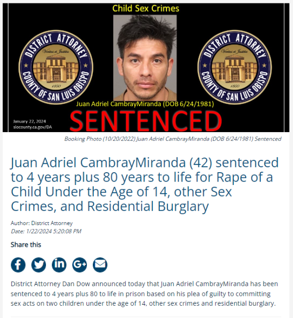 The county district attorney’s office announced yesterday that 42-year-old Juan Adriel Cambray-Miranda of San Luis Obispo has been sentenced to 80 years to life in state prison. This comes after his guilty plea to four counts of sexual assault that involved two separate children under the age of 14. His crimes occurred between April 2016…