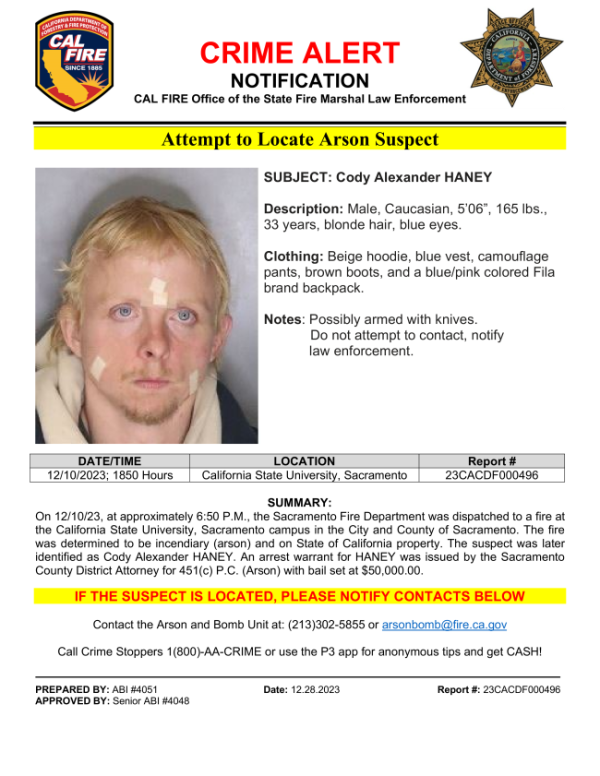 On December 10, 2023, the Sacramento fire department was dispatched to a fire at the California state university Sacramento campus. Cal Fire later determined the fire was caused by arson, and the suspect was identified as Cody Alexander Haney. An arrest warrant for Haney was issued with a bail set to $50 thousand. Cal Fire…