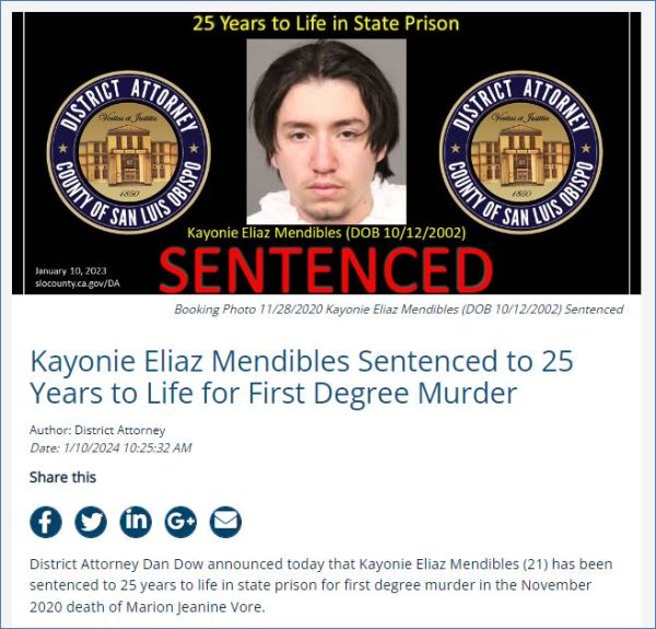 The county district attorney’s office announced that 21-year-old Kayonie Eliaz Mendibles has been sentenced to 25 years to life in prison for the first degree murder of Marion Jeanine Vore. Mendibles pleaded guilty to the murder, knowing his sentence. The crime occurred in the late afternoon of November 27, 2020 at a residence in rural…