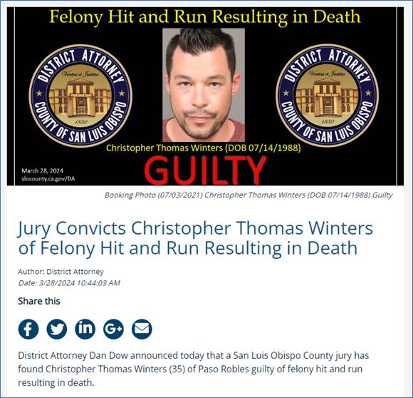 3-28-24 Injury Collision PR The Paso Robles police department responded to a single vehicle traffic collision in the area of Caballo Place and Calle Chorro. Officers found an overturned black SUV in the roadway with no one inside of it. They then located a female hiding in a brush nearby, determined to be the vehicle’s…