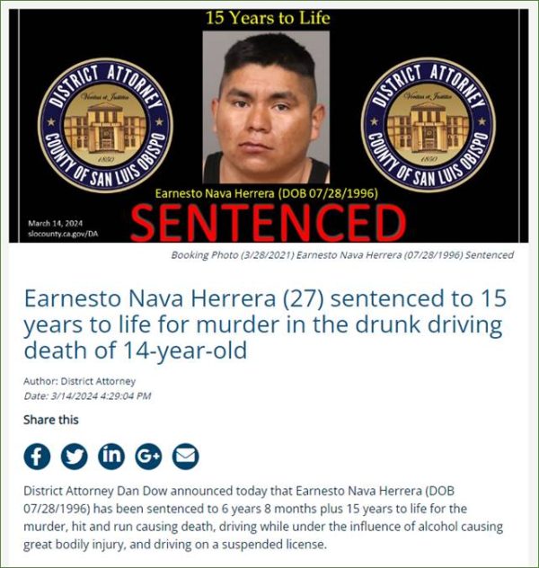 The county district attorney’s office announced that 27-year-old Earnesto Nava Herrera has been sentenced to 15 years to life in prison. Herrera’s sentence comes from an incident on January 30, 2023, where he was driving while heavily intoxicated. He not only collided with 70 feet of metal pipe fencing, knocking over a tree, but he…