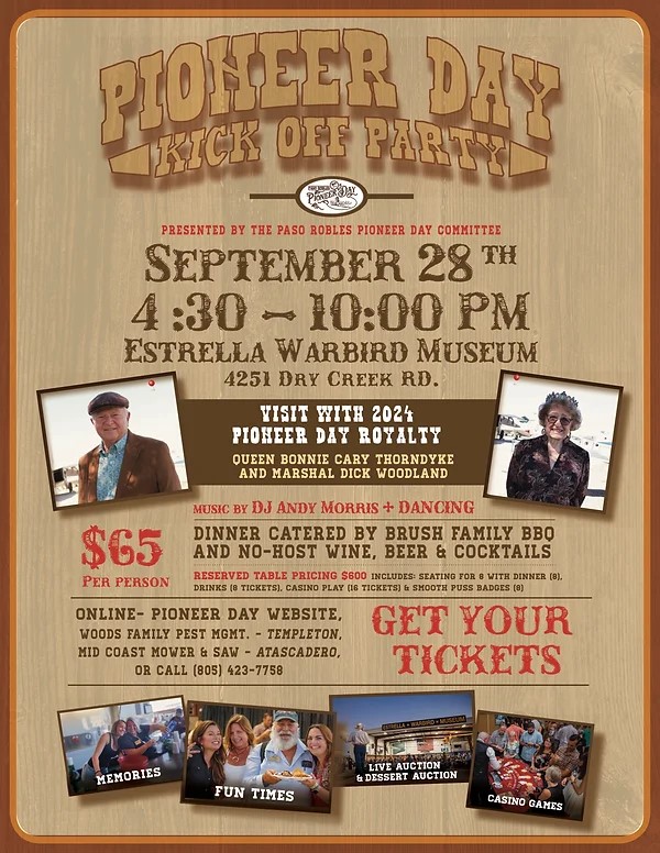 Paso Robles Pioneer Day for 2024 is coming up on Saturday, October 12th in downtown Paso Robles. This weekend, on September 28th, is the Pioneer Day Kickoff Party from 4:30 to 10:00 pm at the Estrella Warbirds campus. Tickets are $65 per person, and the event includes cocktail, dinner, dessert, a live auction, casino games,…