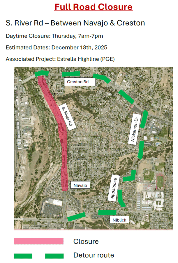 A section of South River road will be closed next week on Thursday, December 18th from 7 am to 7 pm. The city of Paso Robles says the closure is for construction work, consisting of power pole upgrades along the bluff with crane operations. PG&E is in the process of upgrading the power poles as…