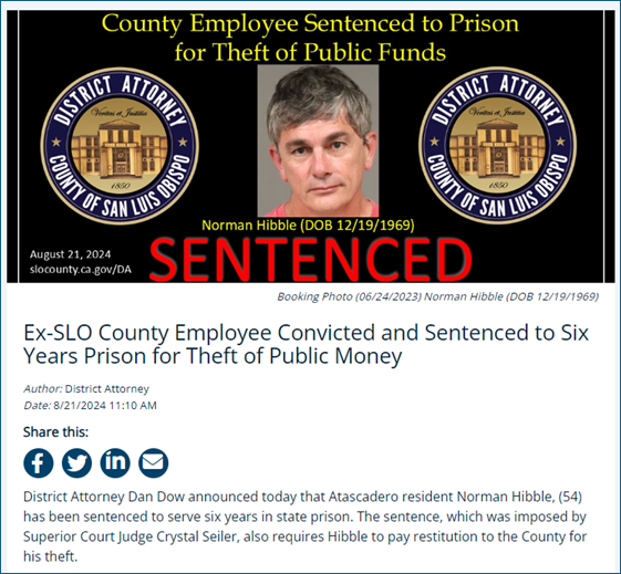 The county district attorney’s office announced that former county employee, 54-year-old Norman Hibble of Atascadero, has been sentenced to six years in state prison. Hibble’s sentencing comes after his guilty plea on July 17th to seven felony counts of misappropriation of public funds for several years. Hibble reportedly used county credit cards to spend over…