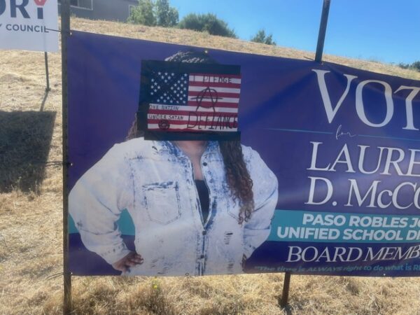 A banner for current Paso Robles school board trustee and running candidate, Laurene D. McCoy, was defaced yesterday afternoon. The banner’s location is on Niblick road, which featured a photograph of Laurene McCoy, trustee candidate for area 5, and information of her campaign. The vandal(s) in question taped a United States flag over McCoy’s face,…