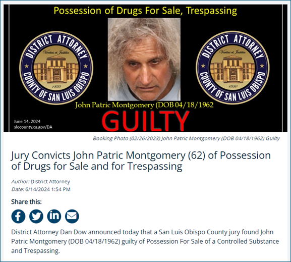 A San Luis Obispo county jury has convicted 62-year-old John Patric Montgomery of trespassing and possession of a controlled substance for sale. The DA’s office released a statement of this conviction, saying that on March 6th this year, police responded to a report that Montgomery was trespassing on private property, and had received two previous…