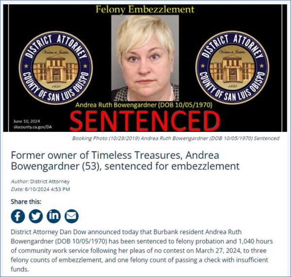 The county district attorney’s office announced that 53-year-old Andrea Ruth Bowengardner of Burbank has been sentenced to felony probation and 1,040 hours of community service work. This follows a pleas of no contest on March 27th to three felony counts of embezzlement, and one felony count of passing a check with insufficient funds. The DA’s…