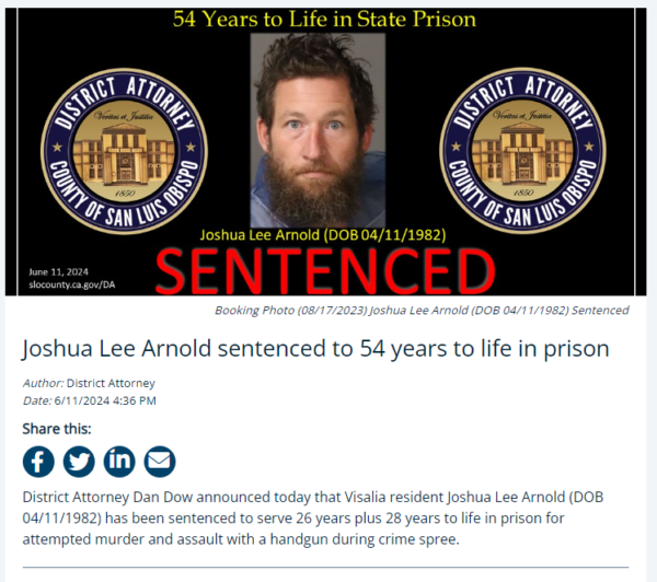 The county district attorney’s office announced that 54-year-old Joshua Lee Arnold of Visalia has been sentenced to serve 26 years plus 28 years to life in prison for attempted murder & assault with a handgun during a crime spree. Arnold pleaded no contest to three counts of attempted murder, two counts of assault with a…