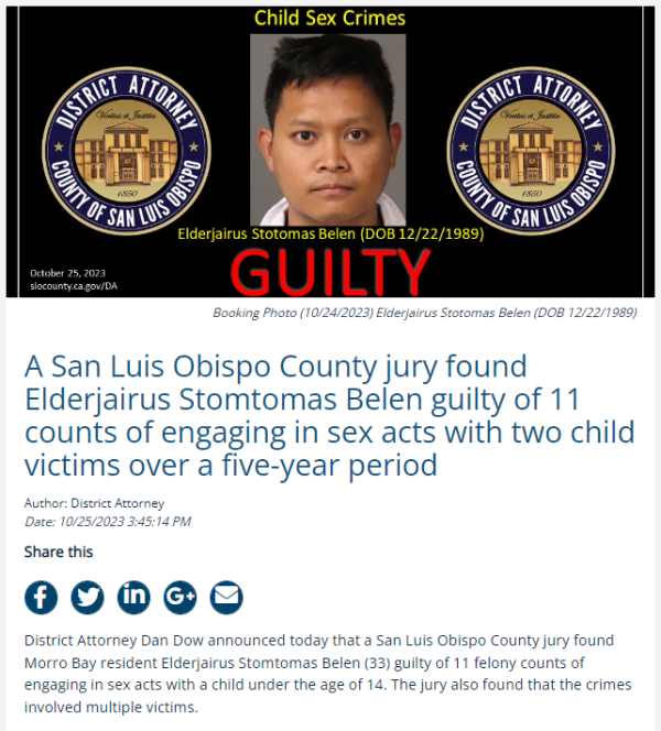 The district attorney’s office announced that jurors found 33-year-old Morro Bay resident Elderjairus Stomtomas Belen guilty of 11 felony counts of engaging in sex acts with a child under the age of 14. The DA’s office says that Belen’s crimes ocurred between 2013 and 2018, where he engaged in a series of sex acts with…