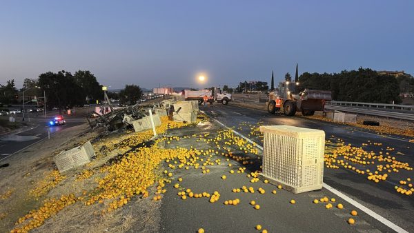 NB 101 closed this morning between Templeton and Paso Robles after a semi-truck collision which spilled oranges all over the roadway at 4:24 this morning. It closed down from Main street in Templeton to 46 west, but they’ve got detours set up and they’re cleaning it up now. They have a hazmat team out there…