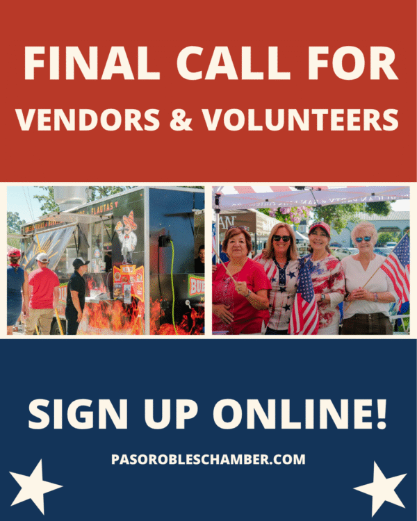 The Paso Robles & Templeton chamber of commerce has released one last call for vendors, volunteers, and sponsors for the 4th of July celebration in Templeton. Vendors can showcase their business, products, or services to hundreds of gathering attendees by signing up at: pasorobleschamber.com. Sponsorship opportunities are also still available to get your business in…