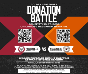 The competition will culminate on Friday, September 19th during the Paso Robles high school homecoming football game. The total funds raised by each school will be revealed during halftime, with bragging rights and the satisfaction of making a difference on the line.