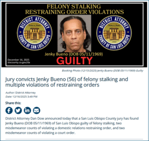 County district attorney Dan Dow announced that a jury has found 56-year-old Jenky Bueno of San Luis Obispo guilty of felony stalking, and violating restraining orders.
